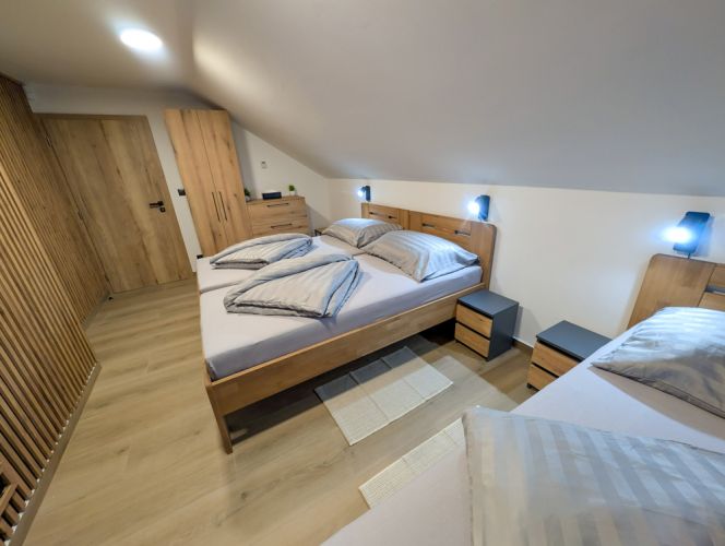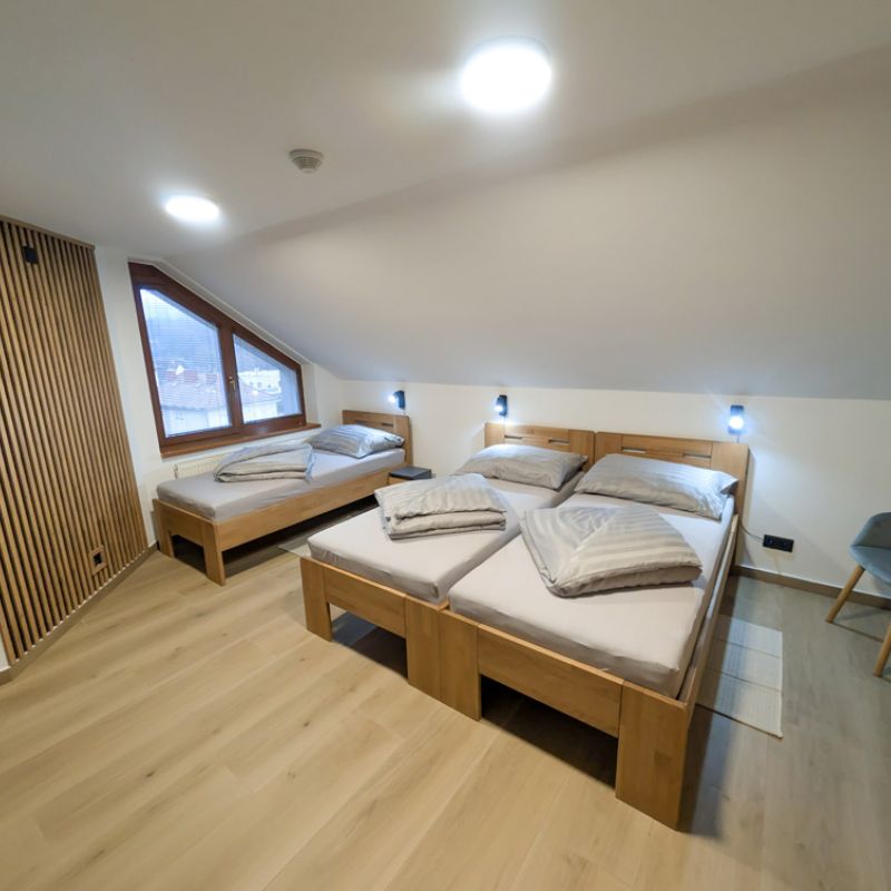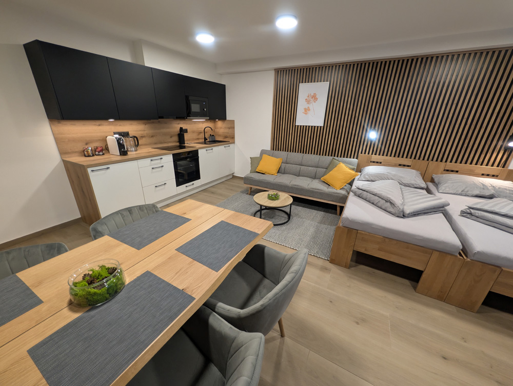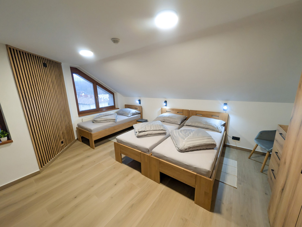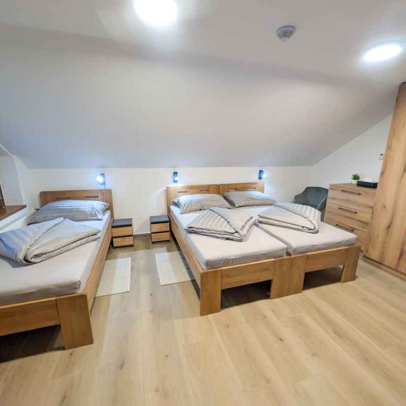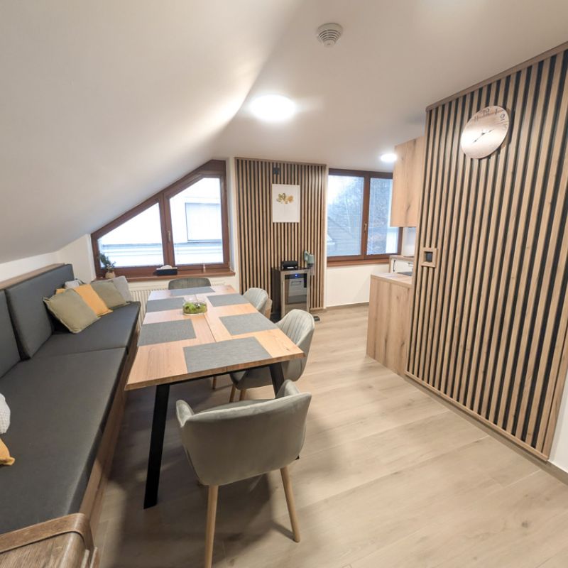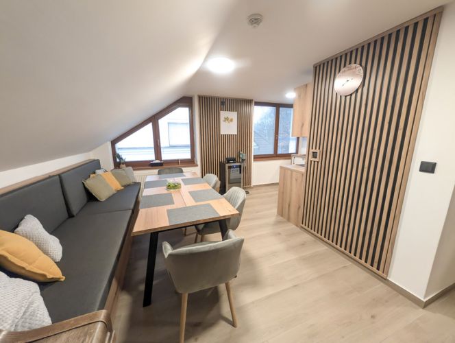 Apartmán 1 nabízí moderní a pohodlné ubytování pro až 6 osob v podkrovním prostoru o rozloze 80 m².