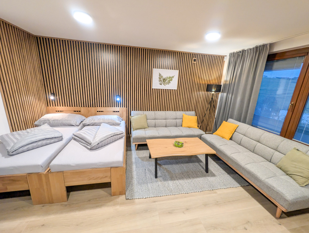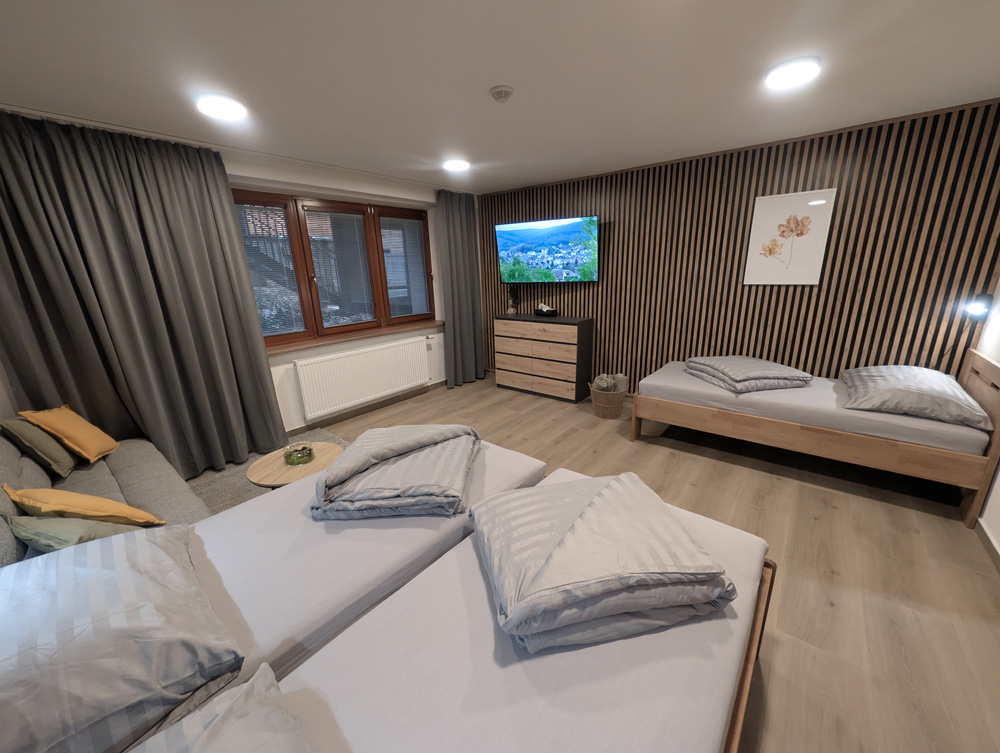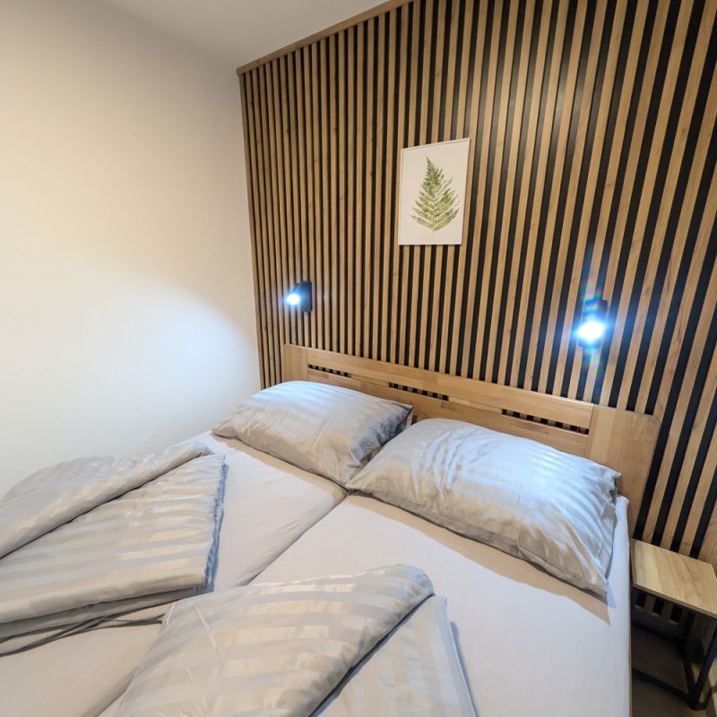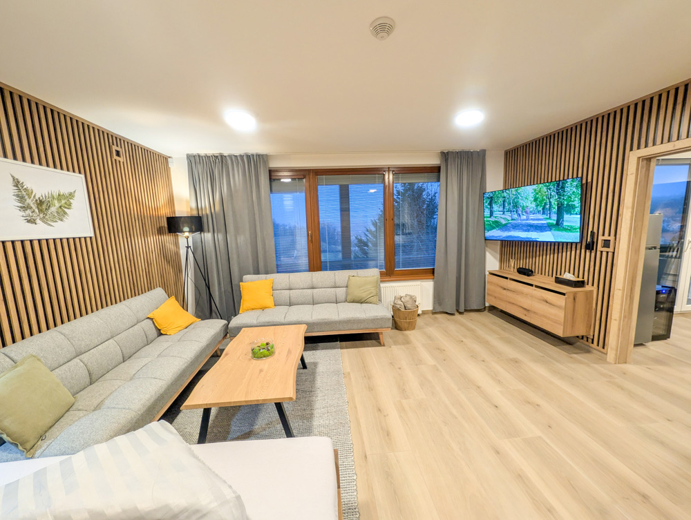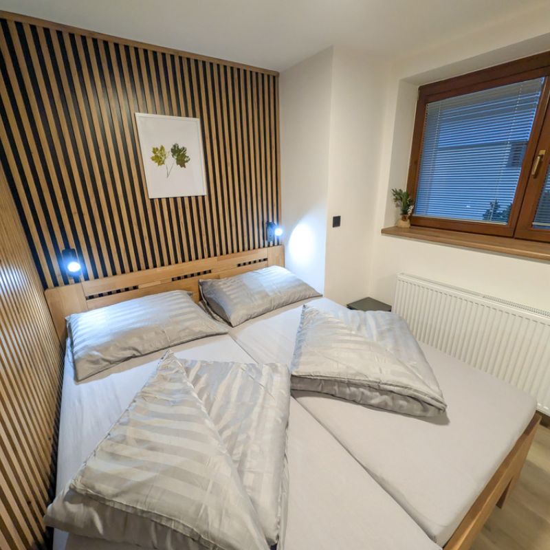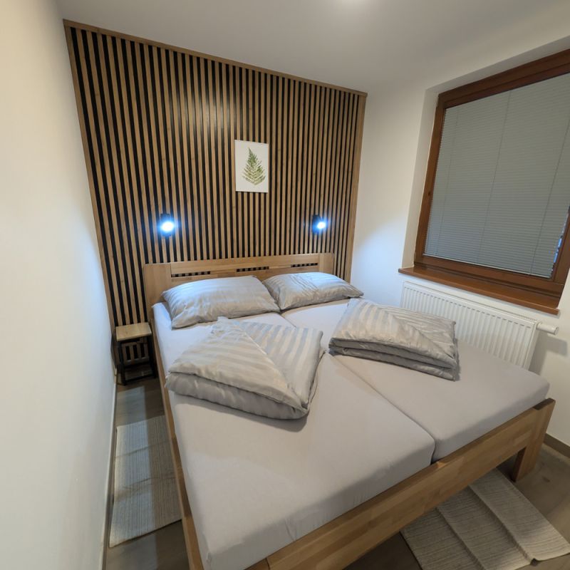 K dispozici jsou dvě samostatné ložnice, které zajišťují dostatek soukromí pro rodiny i skupiny. Velkým benefitem apartmánu je vlastní zahrada, ideální pro relax a bezpečný pobyt s dětmi. Součástí je také plně vybavená kuchyně a zimní zahrada pro celoroční využití. Apartmán poskytuje klidné prostředí, komfort a vše, co potřebujete pro příjemný pobyt: tři chytré TV a rychlé Wi-Fi. Apartmán je skvělou volbou pro ty, kteří hledají komfort, soukromí a klidné prostředí.