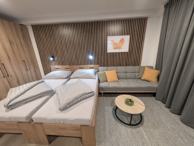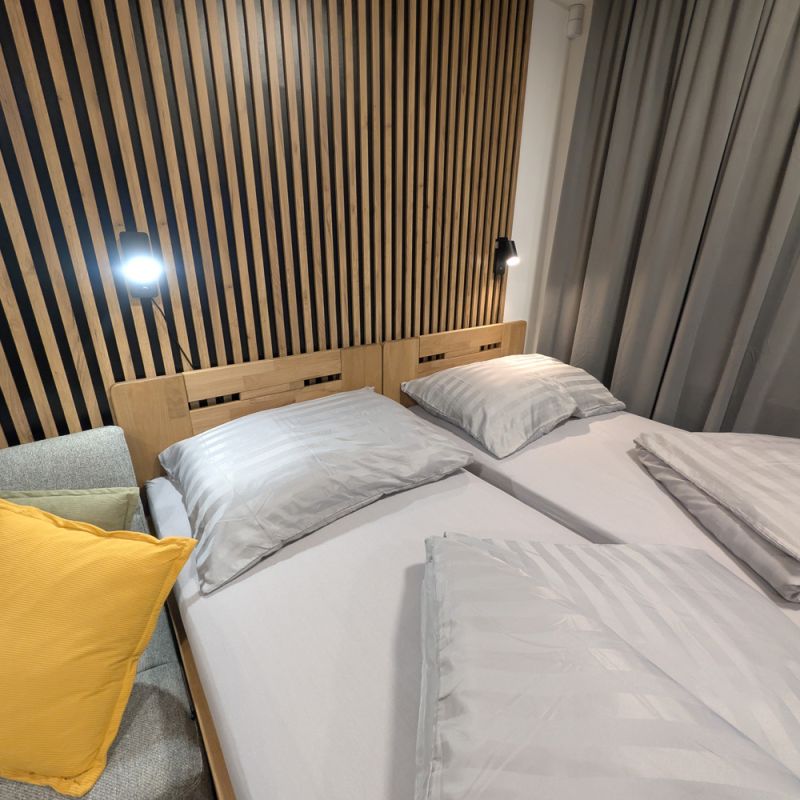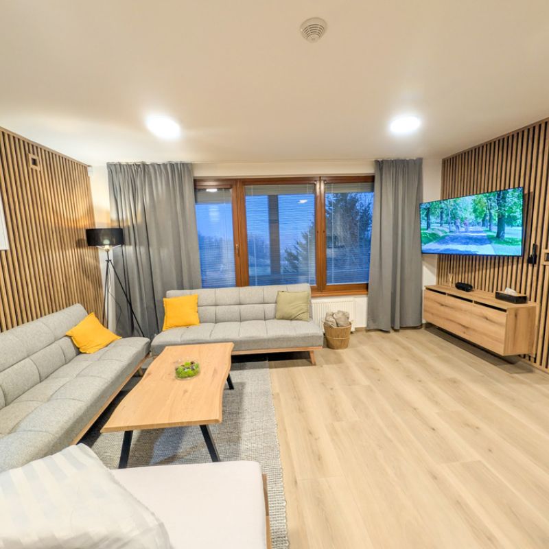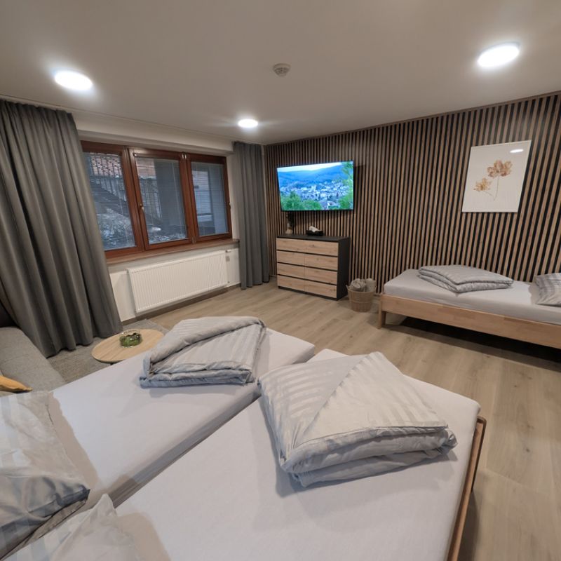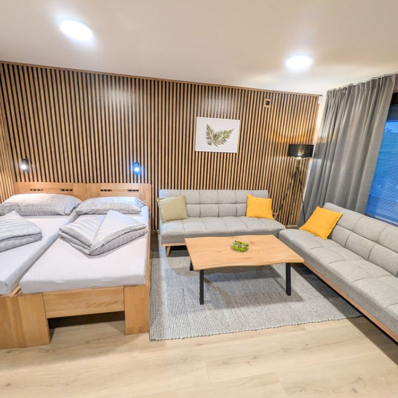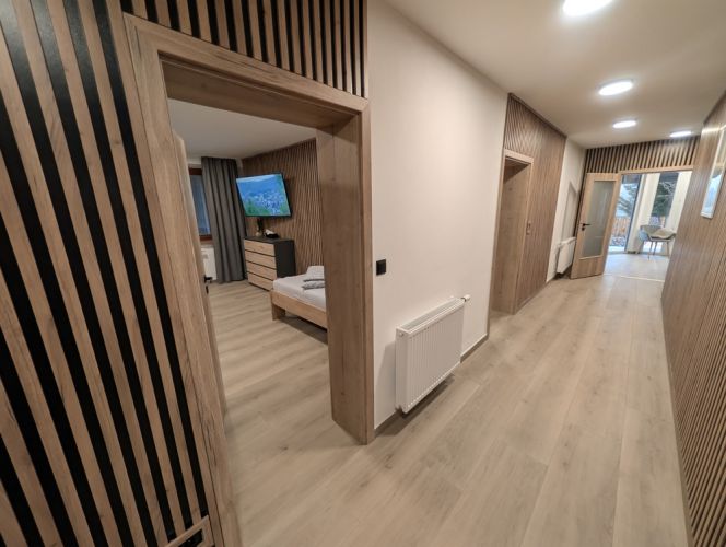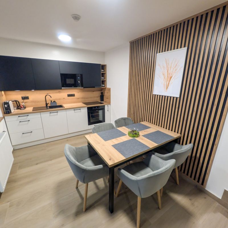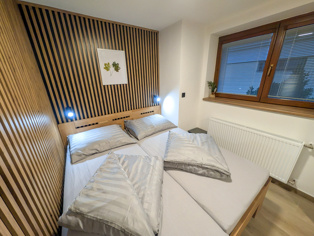K dispozici jsou dvě samostatné ložnice, které zajišťují dostatek soukromí pro rodiny i skupiny. Velkým benefitem apartmánu je vlastní zahrada, ideální pro relax a bezpečný pobyt s dětmi. Součástí je také plně vybavená kuchyně a zimní zahrada pro celoroční využití. Apartmán poskytuje klidné prostředí, komfort a vše, co potřebujete pro příjemný pobyt: tři chytré TV a rychlé Wi-Fi. Apartmán je skvělou volbou pro ty, kteří hledají komfort, soukromí a klidné prostředí.
