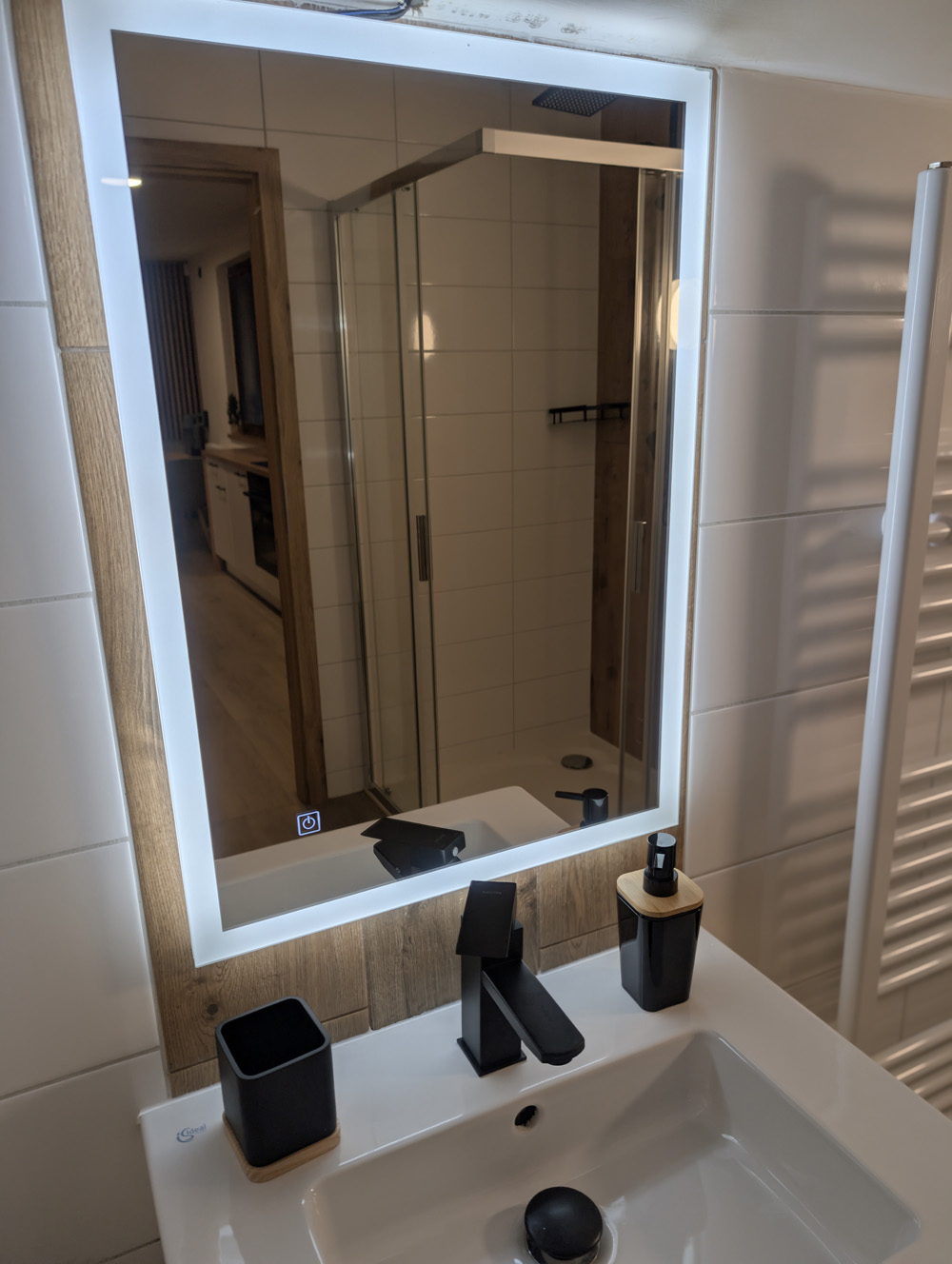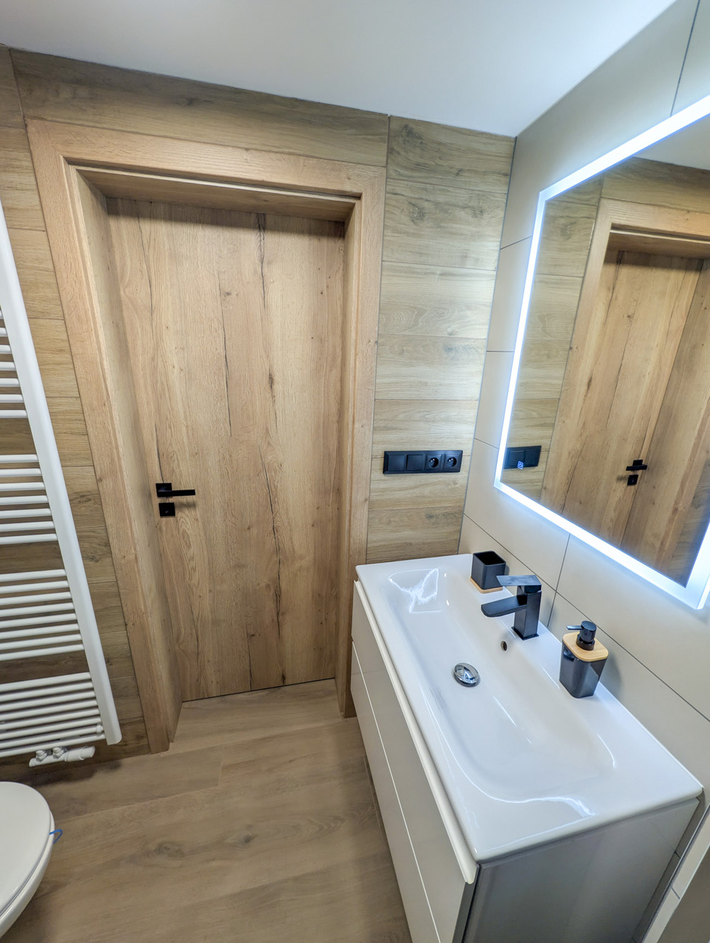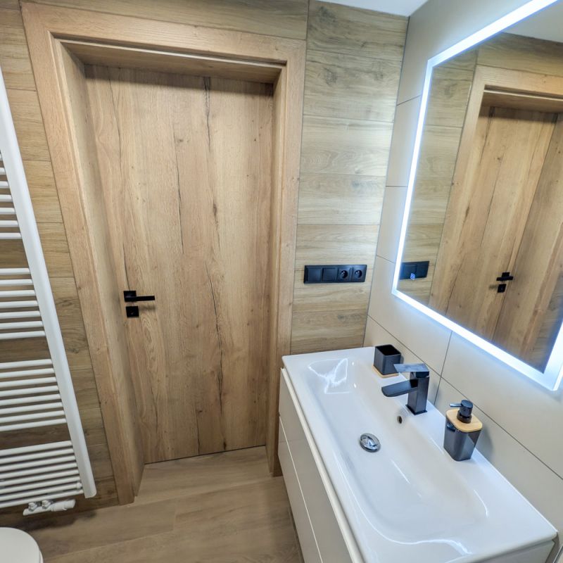 Interiér je navržen v přírodních odstínech dubového dřeva a černých detailů, které doplňuje teplé světlo a čistý design.