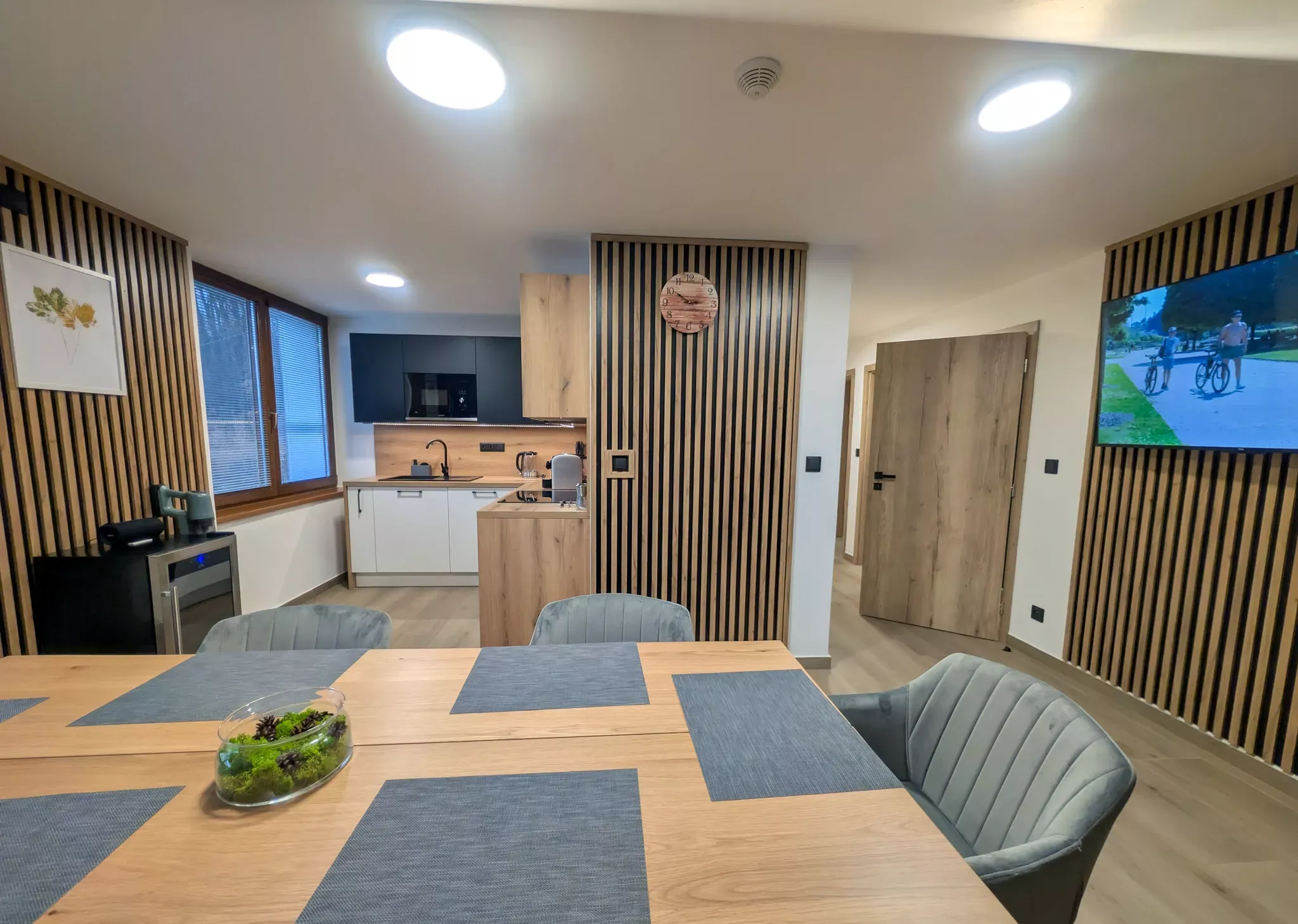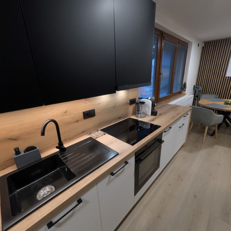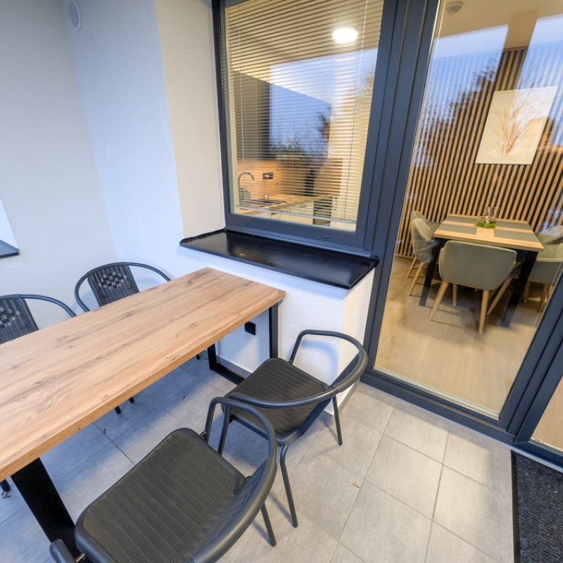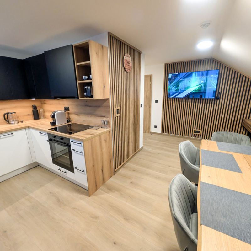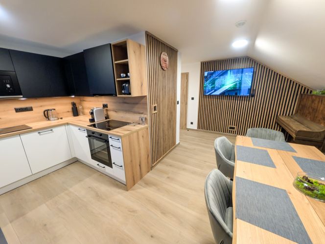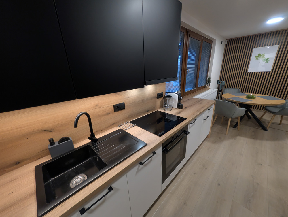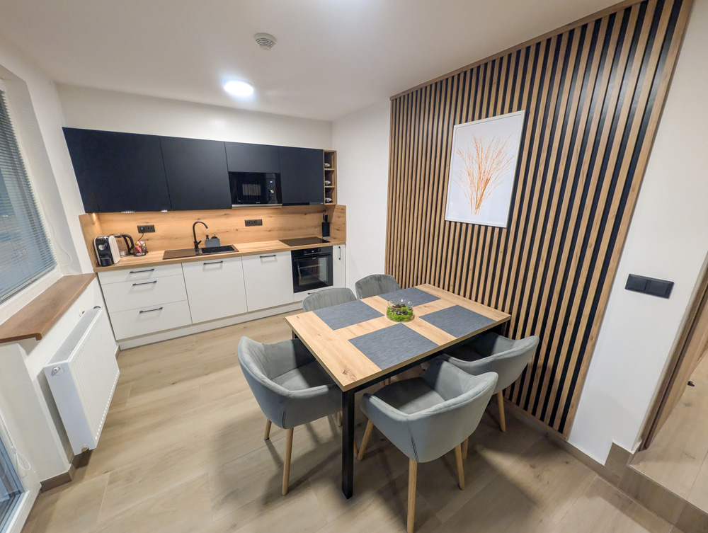 Moderní kuchyň je plně vybavená – nechybí myčka, trouba, indukční deska, mikrovlnná trouba, chladnička s mrazákem, vinotéka ani espresso kávovar. K dispozici jsou i drobné spotřebiče jako mixér, sendvičovač či topinkovač. V obývací části je 55" televize a samozřejmostí je rychlé Wi-Fi připojení. Součástí apartmánu je také předzahrádka o velikosti 8 m² se zahradním posezením, ideální pro ranní kávu nebo večerní relax. Koupelna je vybavena sprchovým koutem, WC a vysoušečem vlasů.