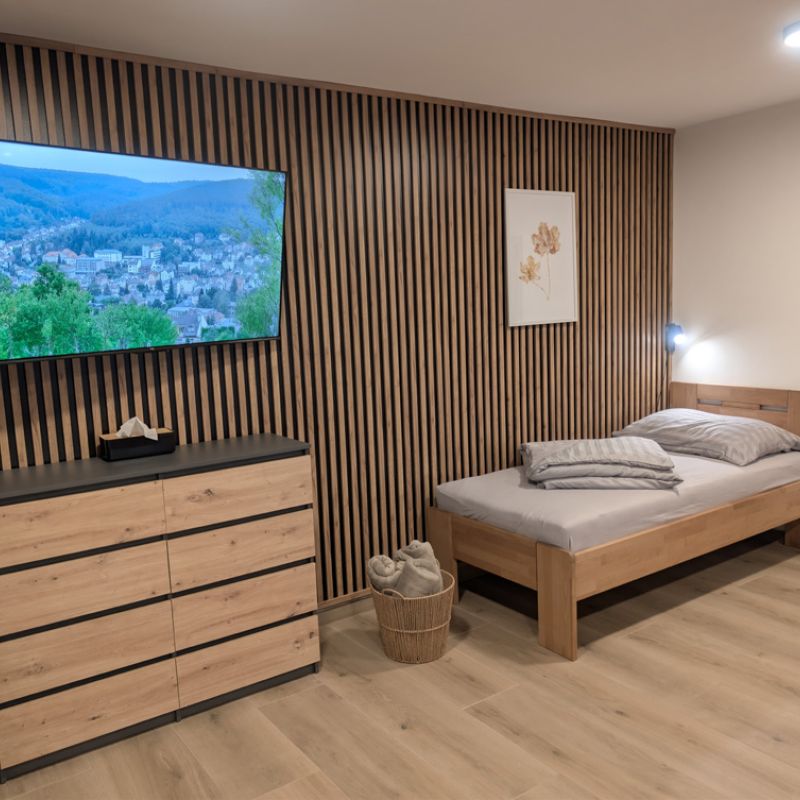 Apartmán 4 nabízí komfortní ubytování o velikosti 33 m² se samostatným vstupem a částečně bezbariérovým přístupem. Součástí je jedna ložnice s manželskou postelí a možností přistýlky. Hosté mají k dispozici garantované parkovací místo přímo u objektu.