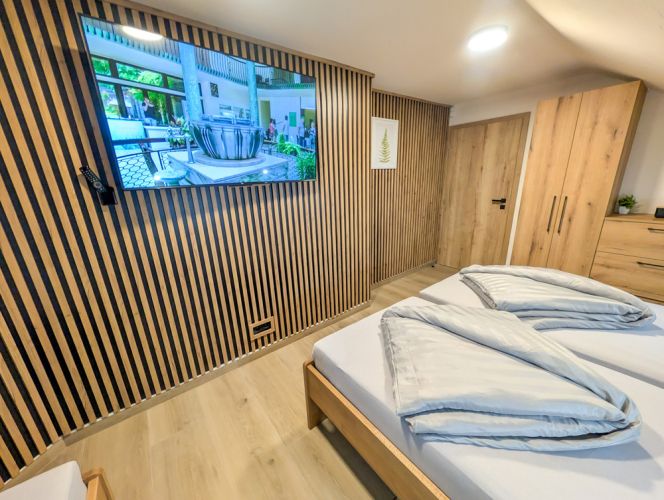 Přízemní apartmán nabízí komfortní ubytování s přímým vstupem na velkorysý balkon, ze kterého je krásný výhled do zahrady a okolní přírody.