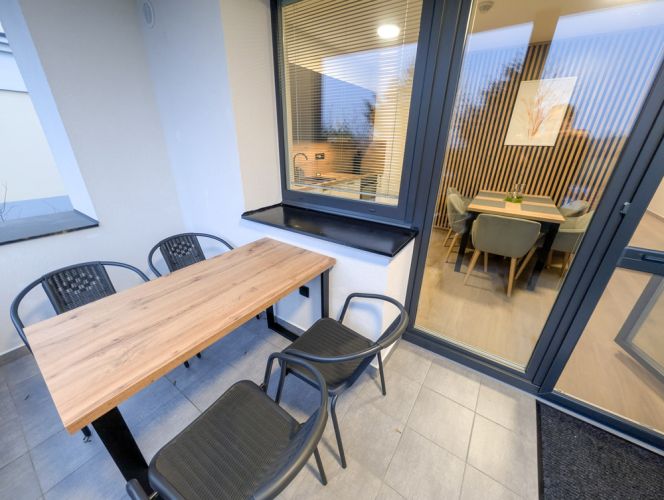 Součástí apartmánu je vlastní vstup, balkon s posezením a garantované parkovací místo přímo u objektu.